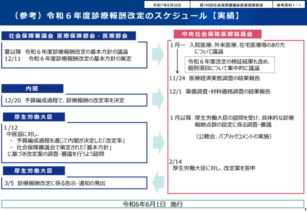 2025年4月に発表された検討スケジュールは下記の通りになります。12月6日現在、少し遅れはあるものの、おおむね例年通りのスケジュールです。12月中には意見の集約を行い、全体の改定率(※医療機関などに支払われる価格が、改定によって前回からどれくらい増減するかを示す割合)の発表を行うものとみられます。