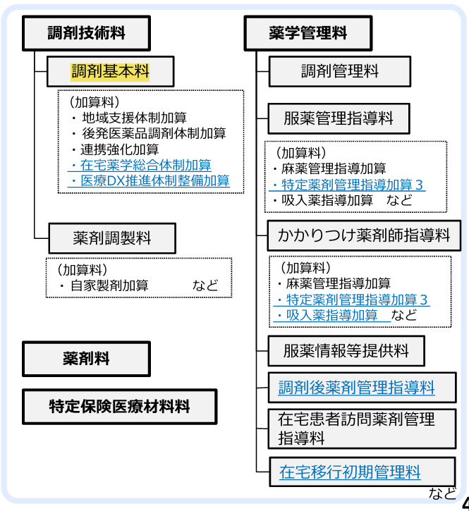 調剤報酬点数は、医薬品、医療機器の直接的費用である薬剤料・特定保険医療材料を除けば、調剤技術料・薬学管理料の2つからなっています。