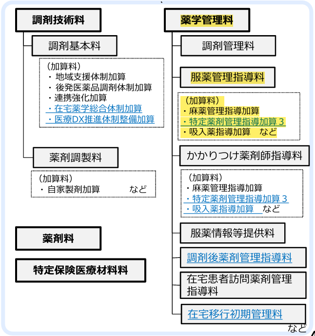 現在のところ、服薬管理指導料の加算のうち、厚生労働大臣が定める特に安全管理が必要な医薬品を用いた等の場合に算定する「特定薬剤管理指導加算1~3」、対象患者が6歳未満の乳幼児の場合に算定する「乳幼児服薬指導加算」、医療的ケア児(18歳未満)を対象とした「小児特定加算」について特に言及はありませんでした。