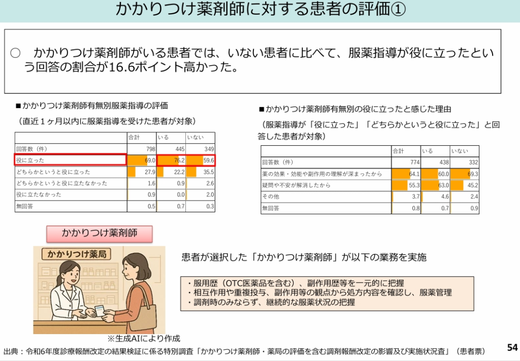 正直に申し上げますと、かかりつけ薬剤師指導料の見通しは、現段階では不明です。しかし、かかりつけ薬剤師の服薬指導について、一定の評価はあるようです。