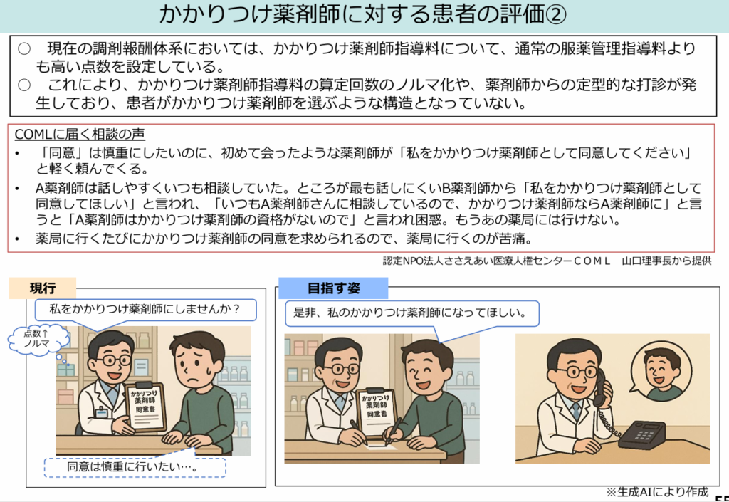 - 約半数の薬局で同意件数等のノルマがあり、「患者の主体的な選択」ではなく「薬局側の目標達成」のための同意取得が行われている実態がある。
