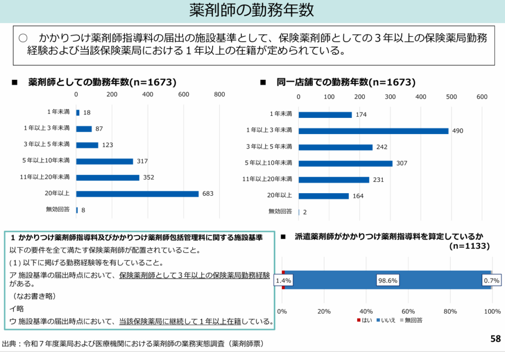 - 保険薬剤師としての3年以上の保険薬局勤務経験および当該保険薬局における1年以上の在籍が定められている。この要件が足かせとなり、「患者の主体的な選択」を妨げている可能性がある。
