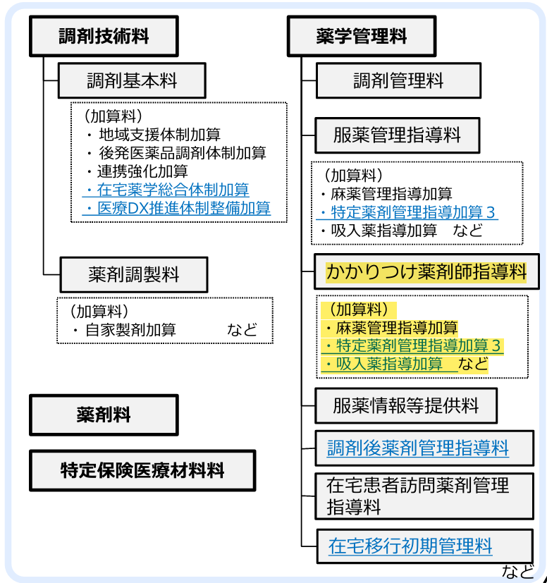 調剤報酬点数は、医薬品、医療機器の直接的費用である薬剤料・特定保険医療材料を除けば、調剤技術料・薬学管理料の2つからなっています。