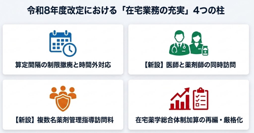 在宅医療における薬局の役割は、単なる「薬のお届け」ではなく、「医師等と緊密に連携しながら高度な薬学的管理を提供し、地域の24時間対応を支える拠点」としての機能がより強く求められる体系へとシフトしたと言えます。