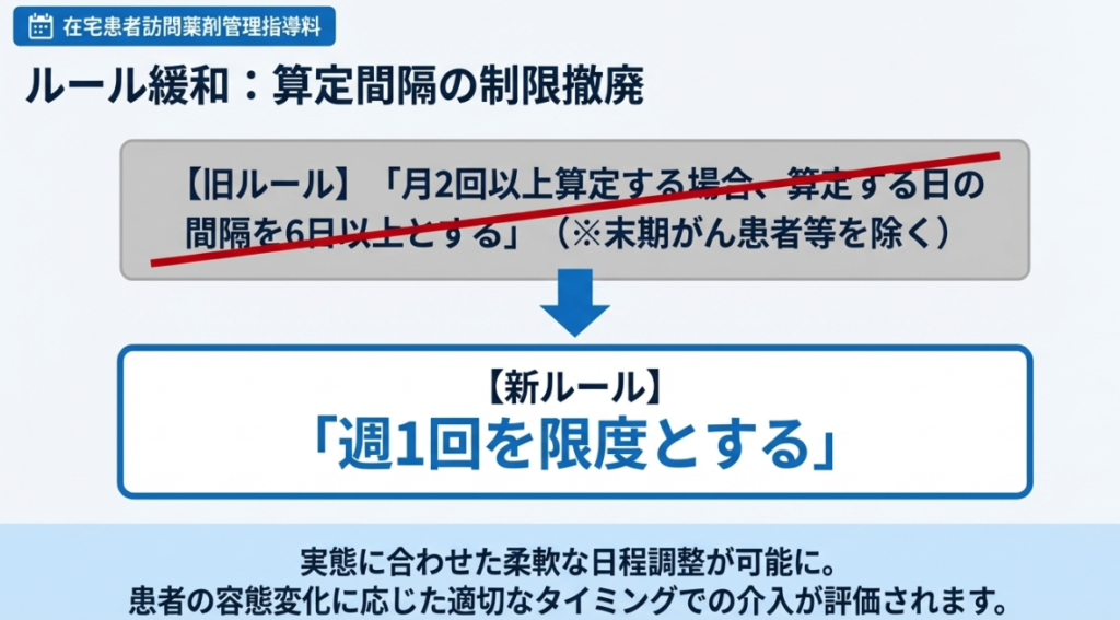 - 「6日間隔」制限の撤廃:これまで、月2回以上算定する場合(末期がん患者等を除く)は「算定する日の間隔を6日以上とする」という制限がありましたが、これが撤廃され、「週1回を限度とする」に見直されました。これにより、患者の状況に合わせた柔軟な日程調整が可能になります。