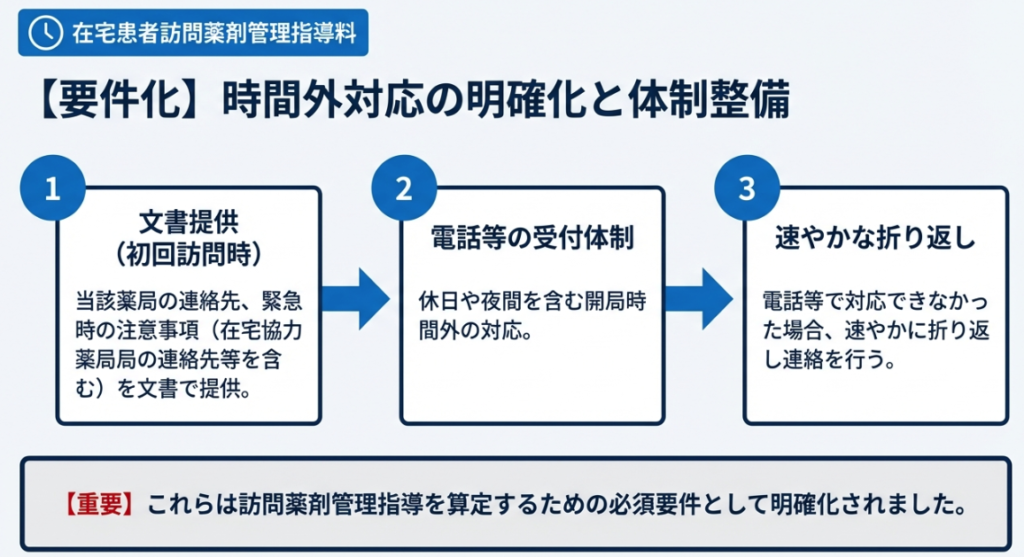 - 時間外対応の明確化(要件追加):休日や夜間を含む開局時間外であっても対応できるよう、初回の訪問時に当該薬局の連絡先や緊急時の注意事項(在宅協力薬局の連絡先等を含む)を文書で提供し、電話等で対応できなかった場合は速やかに折り返し連絡を行うことが新たに要件化されました。
