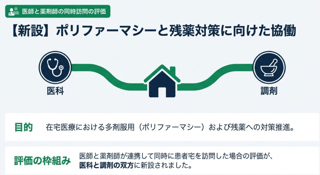 在宅医療におけるポリファーマシー(多剤服用)対策や残薬対策を推進するため、医師と薬剤師が連携して同時に患者宅を訪問した場合の評価が新設されました。この評価は、医科と調剤(薬局)の双方に設けられています。