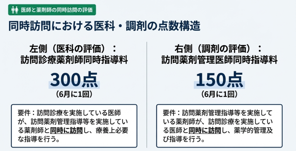 - 医科の評価:訪問診療薬剤師同時指導料(300点/6月に1回)