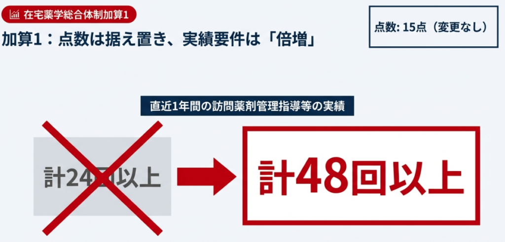 - 点数は据え置きですが、直近1年間の訪問薬剤管理指導等の実績要件が、旧基準の「計24回以上」から「計48回以上」へと倍増しました。