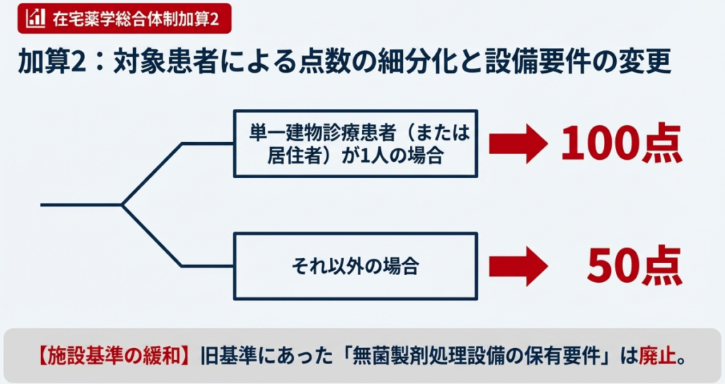 - 点数の細分化:単一建物診療患者(または居住者)が1人の場合は「100点」、それ以外の場合は「50点」へと評価が分かれました。