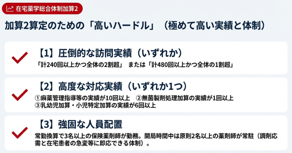 - 高度な実績(いずれか1つを満たす):①麻薬管理指導等の実績が10回以上、②無菌製剤処理加算の実績が1回以上、③乳幼児加算・小児特定加算の実績が6回以上のいずれかを満たすこと。